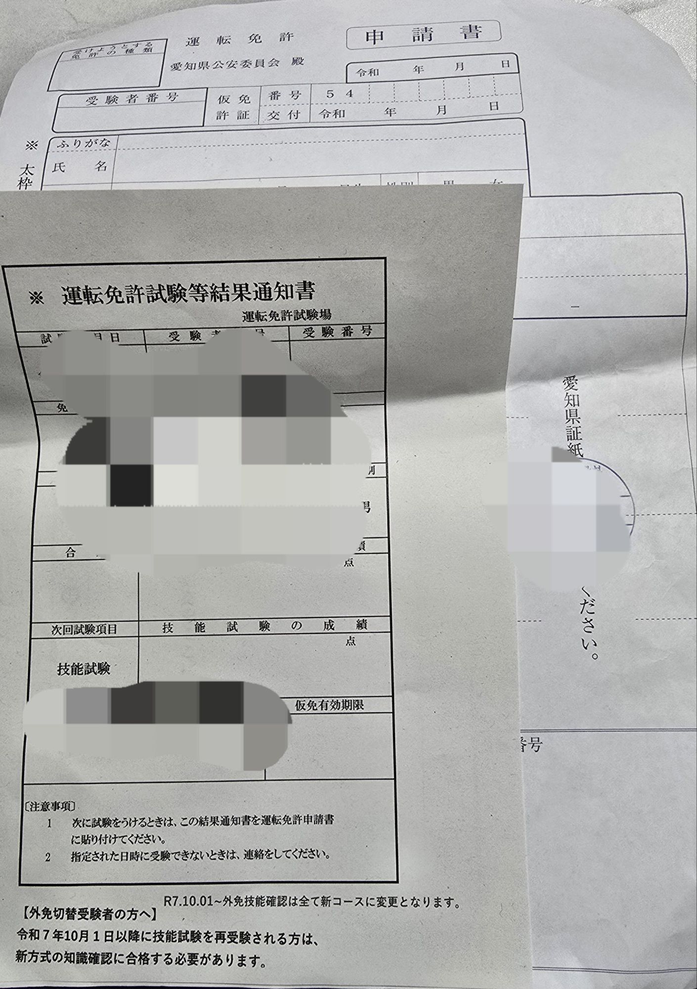 朝1日、窓口で受験票、申請書、試験用自動車使用料領収書、免許証を出します。